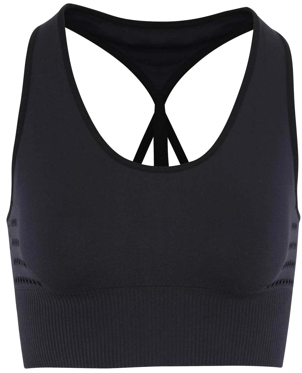 Stylish TriDri® sports bra for low to medium impact workouts. Seamless knit technology offers Medium support sports bra with a slip over design and short under-bust light ribbed structure for a short crop top look and feel. Cross back Racer style finish and halter neck over-shoulder support.